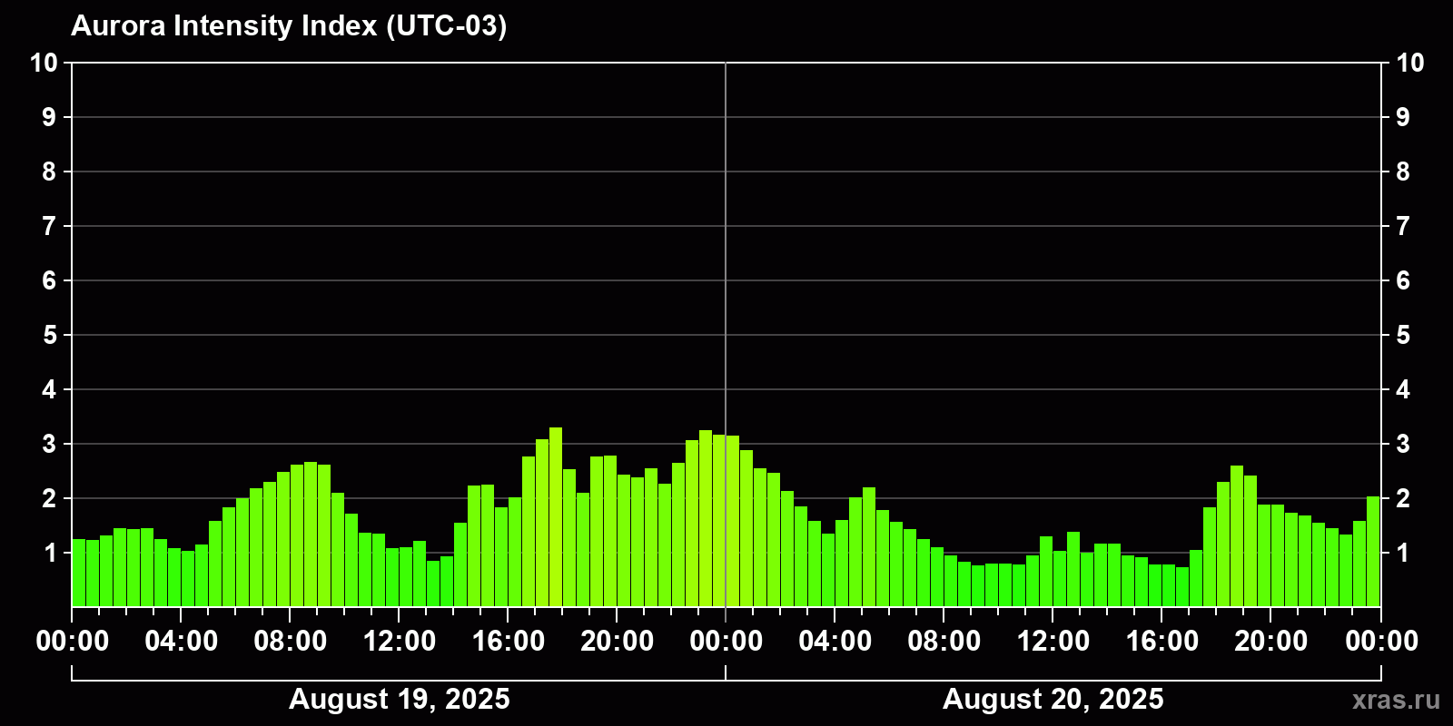 Changes in the auroral intensity index from 2025-08-19 to 2025-08-20 local time