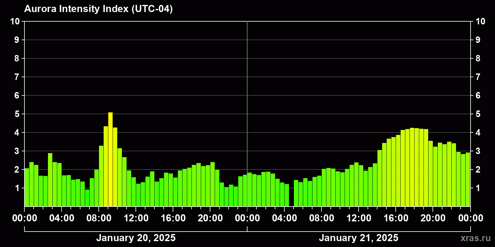 Auroral intensity index and the theoretically possible latitude of observations for nighttime in the Western Hemisphere as of 2025-01-21 23:50 (end of day) local time