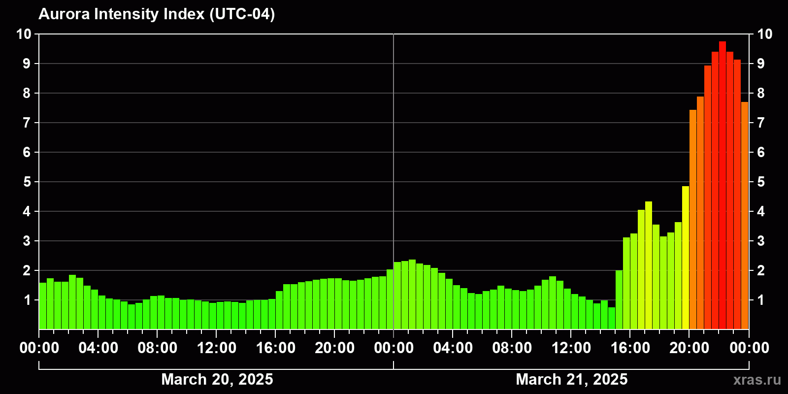 Auroral intensity index and the theoretically possible latitude of observations for nighttime in the Western Hemisphere as of 2025-03-21 23:54 (end of day) local time