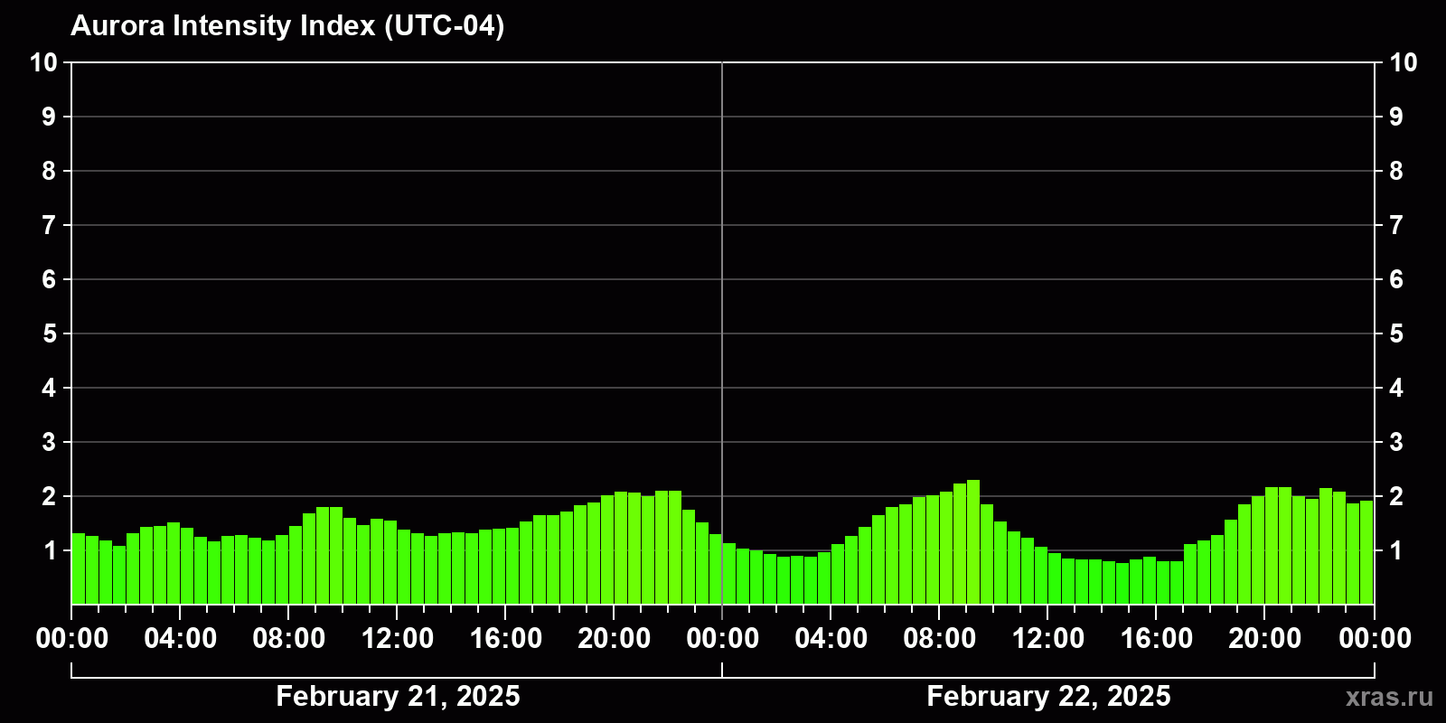 Auroral intensity index and the theoretically possible latitude of observations for nighttime in the Western Hemisphere as of 2025-02-22 23:47 (end of day) local time