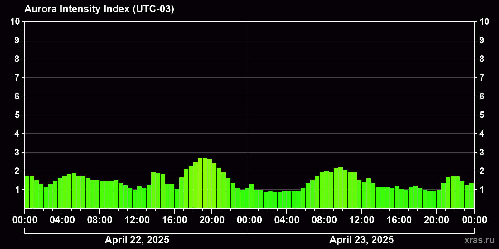 Changes in the auroral intensity index from 2025-04-22 to 2025-04-23 local time