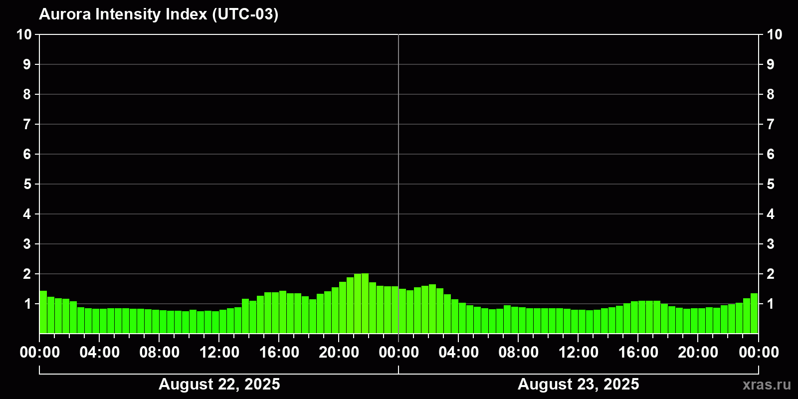 Auroral intensity index and the theoretically possible latitude of observations for nighttime in the Western Hemisphere as of 2025-08-23 23:55 (end of day) local time