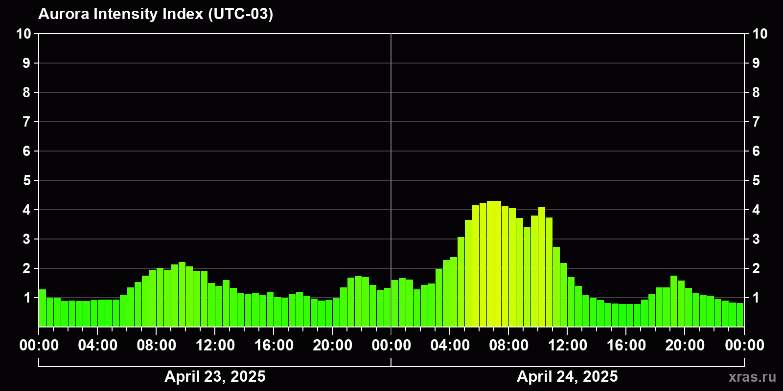 Auroral intensity index and the theoretically possible latitude of observations for nighttime in the Western Hemisphere as of 2025-04-24 23:48 (end of day) local time