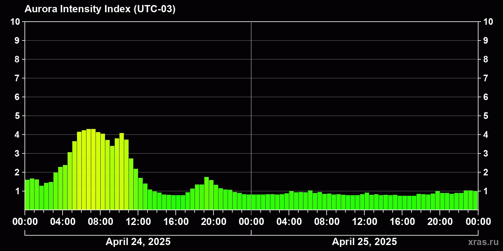 Auroral intensity index and the theoretically possible latitude of observations for nighttime in the Western Hemisphere as of 2025-04-25 23:57 (end of day) local time