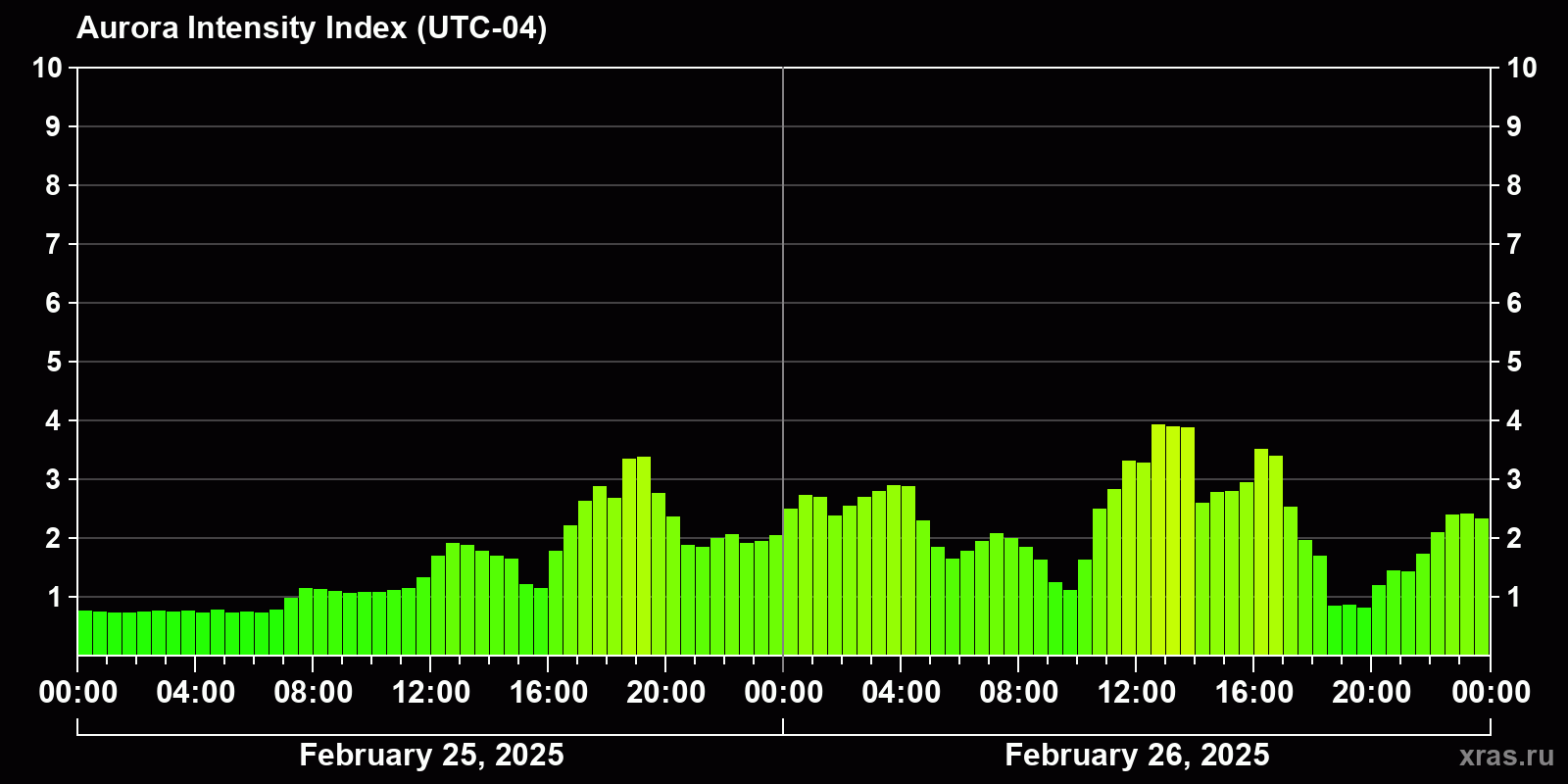 Auroral intensity index and the theoretically possible latitude of observations for nighttime in the Western Hemisphere as of 2025-02-26 23:55 (end of day) local time