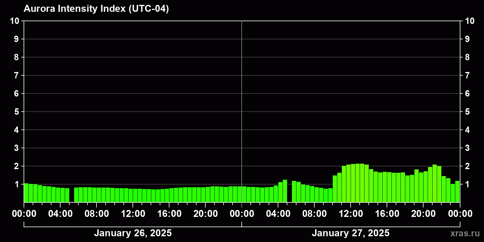 Changes in the auroral intensity index from 2025-01-26 to 2025-01-27 local time