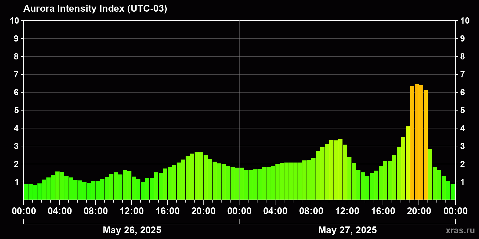 Changes in the auroral intensity index from 2025-05-26 to 2025-05-27 local time