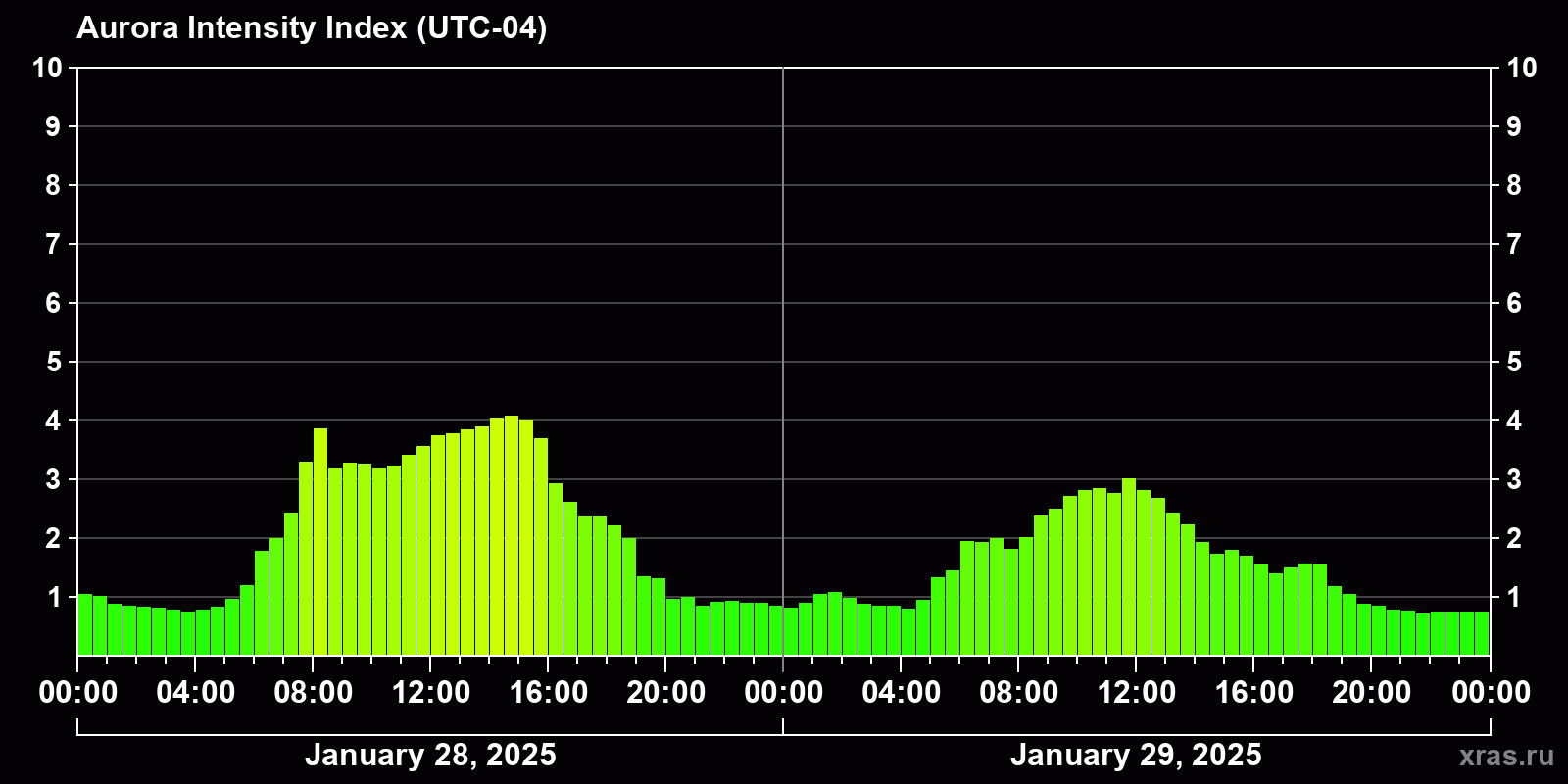 Auroral intensity index and the theoretically possible latitude of observations for nighttime in the Western Hemisphere as of 2025-01-29 23:57 (end of day) local time