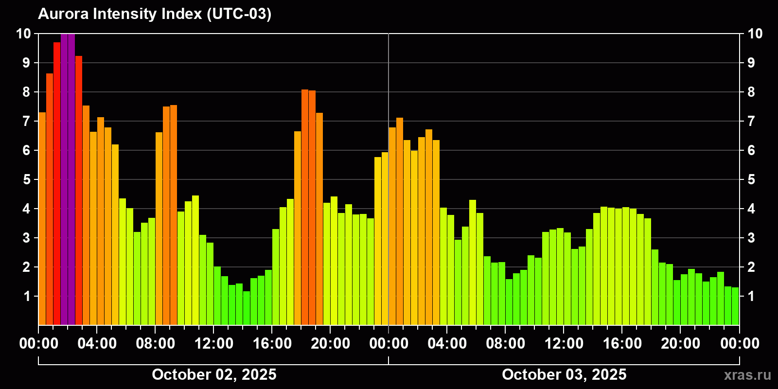 Changes in the auroral intensity index from 2025-10-02 to 2025-10-03 local time