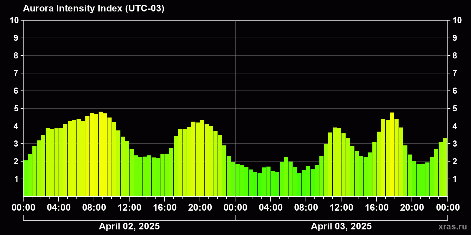 Auroral intensity index and the theoretically possible latitude of observations for nighttime in the Western Hemisphere as of 2025-04-03 23:48 (end of day) local time