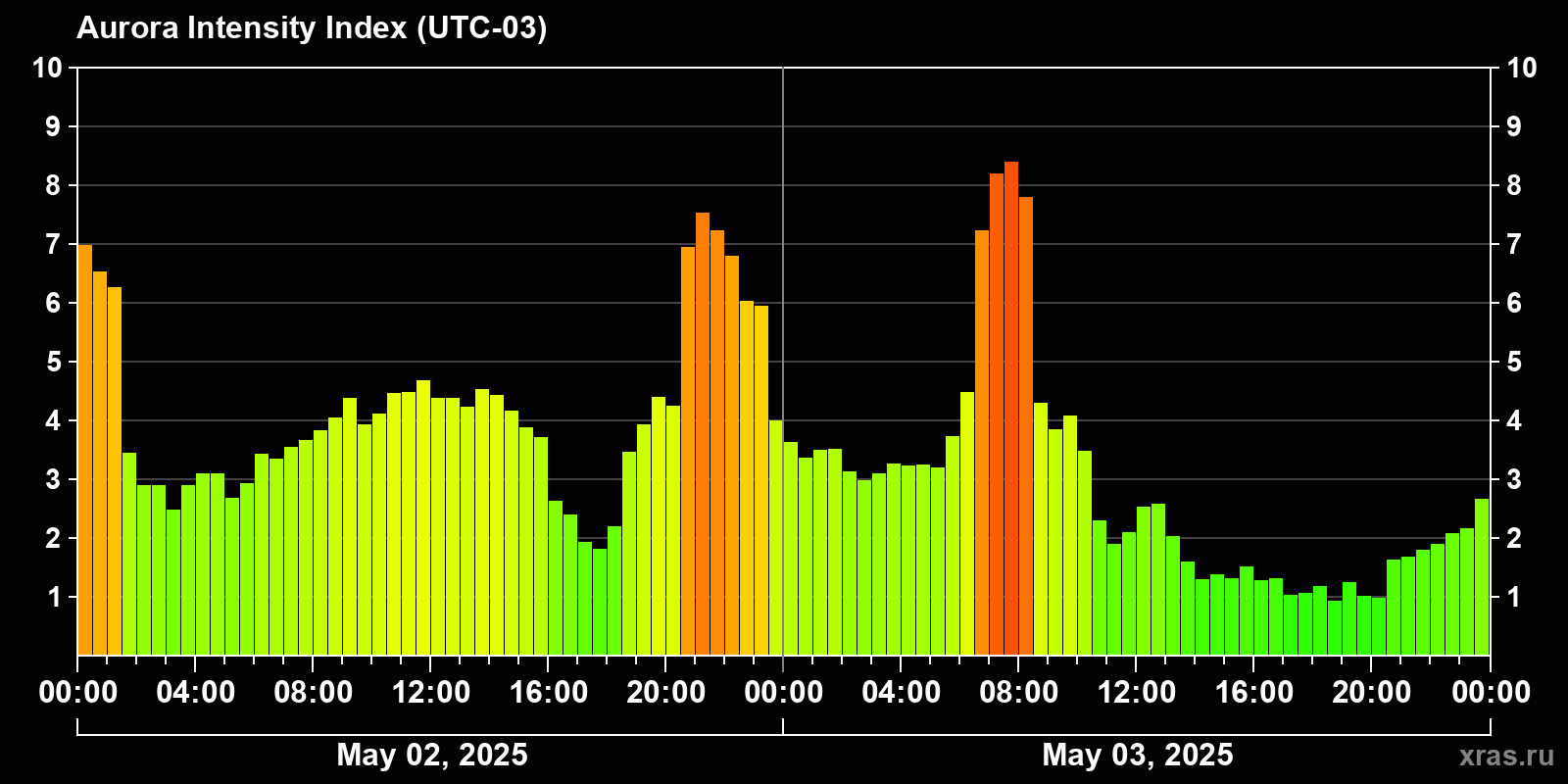 Changes in the auroral intensity index from 2025-05-02 to 2025-05-03 local time