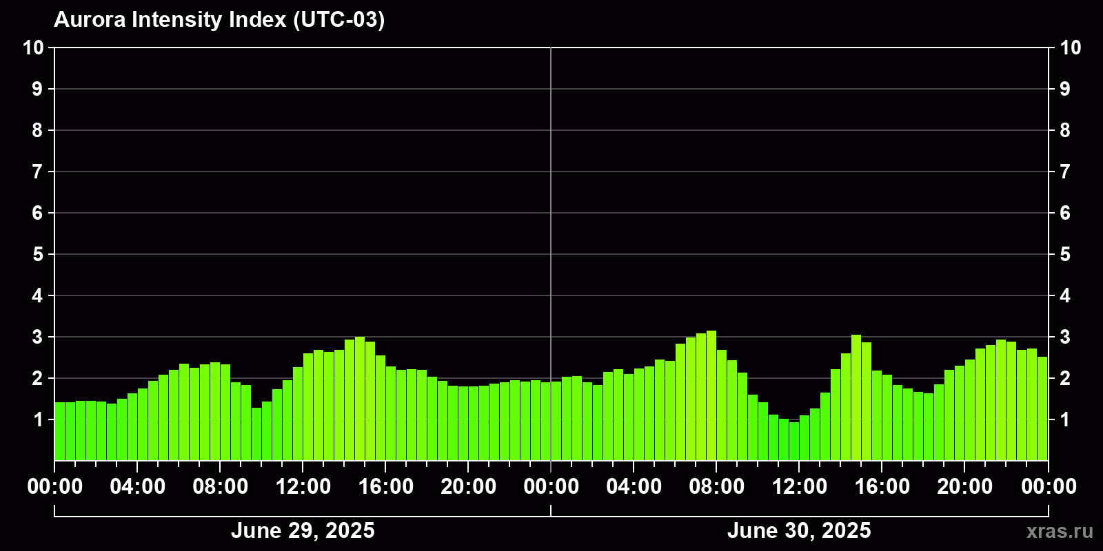 Changes in the auroral intensity index from 2025-06-29 to 2025-06-30 local time