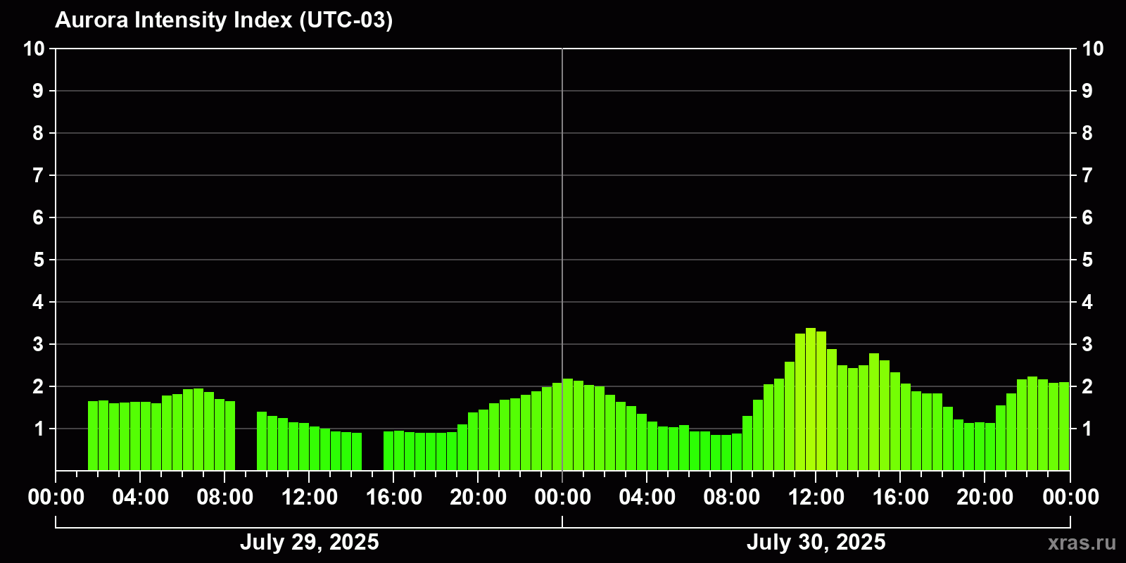 Changes in the auroral intensity index from 2025-07-29 to 2025-07-30 local time