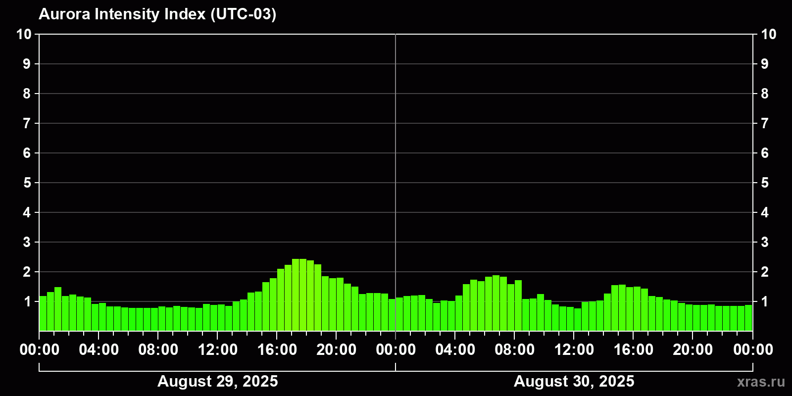 Auroral intensity index and the theoretically possible latitude of observations for nighttime in the Western Hemisphere as of 2025-08-30 23:46 (end of day) local time
