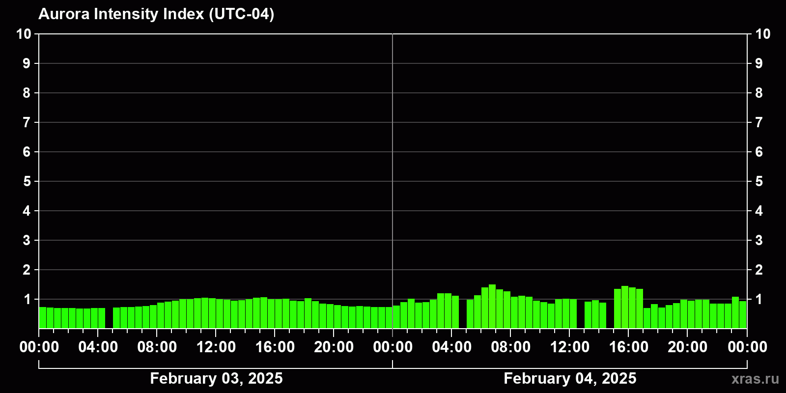 Changes in the auroral intensity index from 2025-02-03 to 2025-02-04 local time
