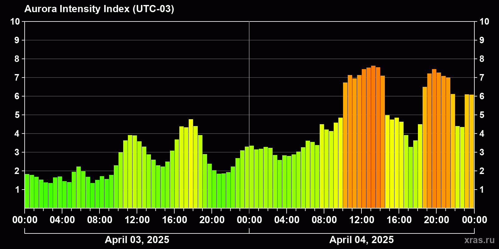 Changes in the auroral intensity index from 2025-04-03 to 2025-04-04 local time