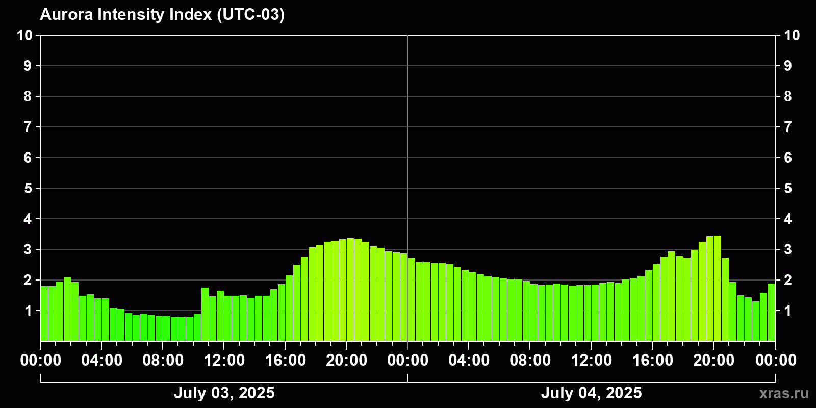 Changes in the auroral intensity index from 2025-07-03 to 2025-07-04 local time