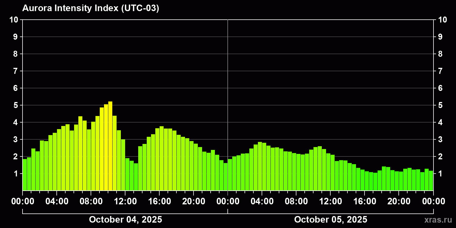 Changes in the auroral intensity index from 2025-10-04 to 2025-10-05 local time