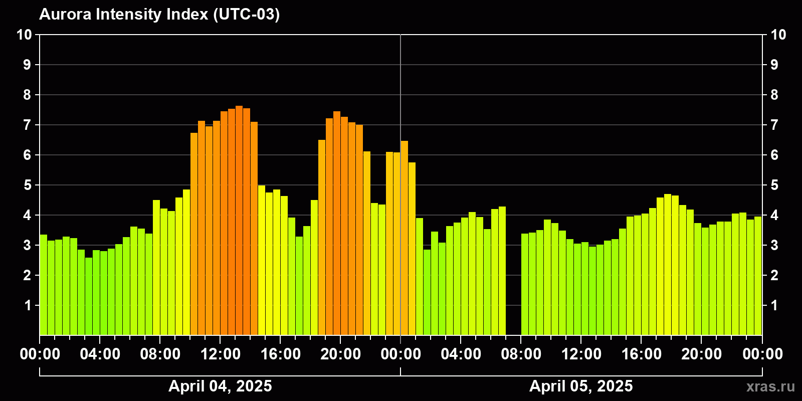 Changes in the auroral intensity index from 2025-04-04 to 2025-04-05 local time