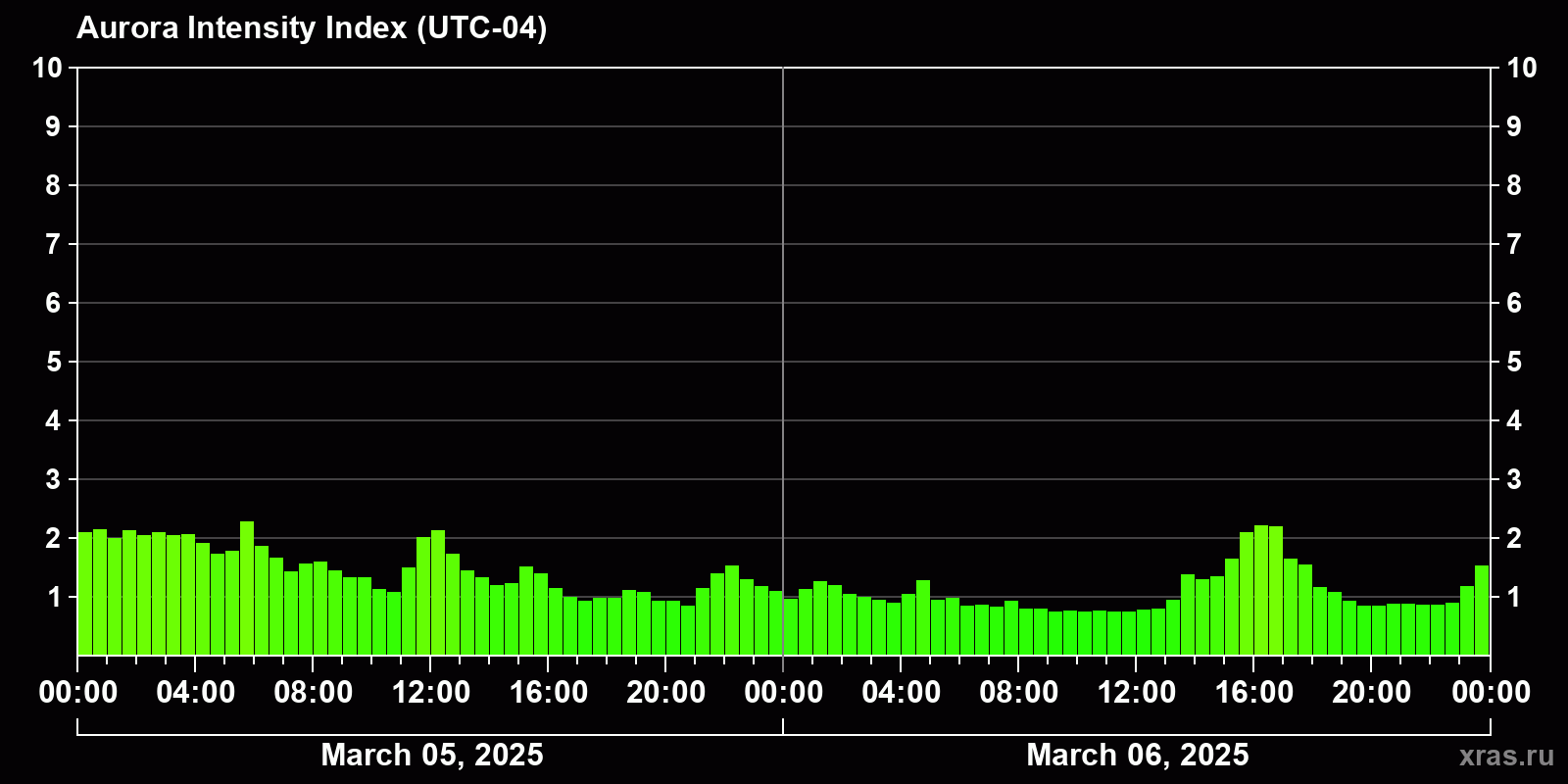 Changes in the auroral intensity index from 2025-03-05 to 2025-03-06 local time
