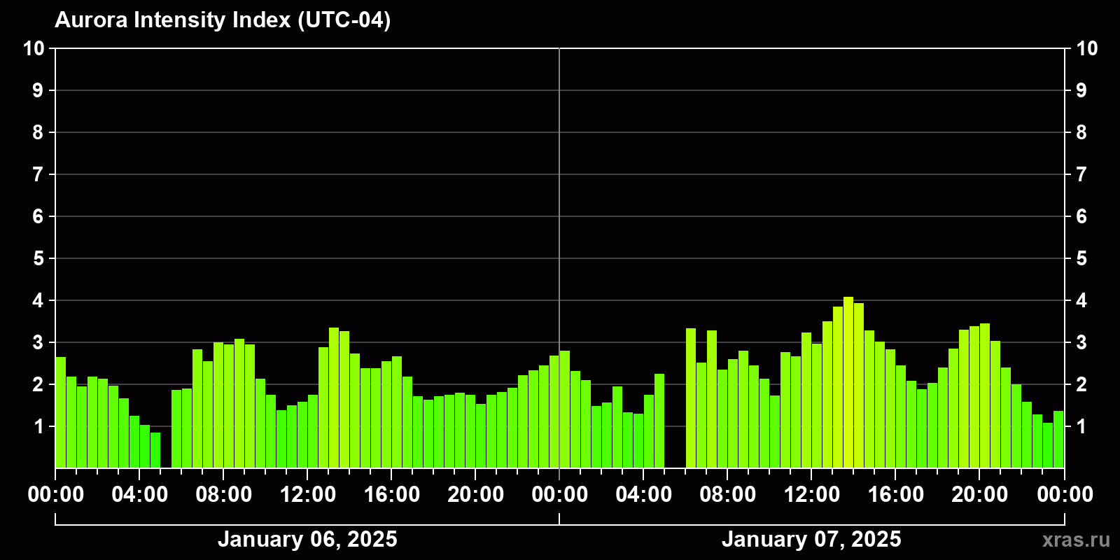 Auroral intensity index and the theoretically possible latitude of observations for nighttime in the Western Hemisphere as of 2025-01-07 23:47 (end of day) local time