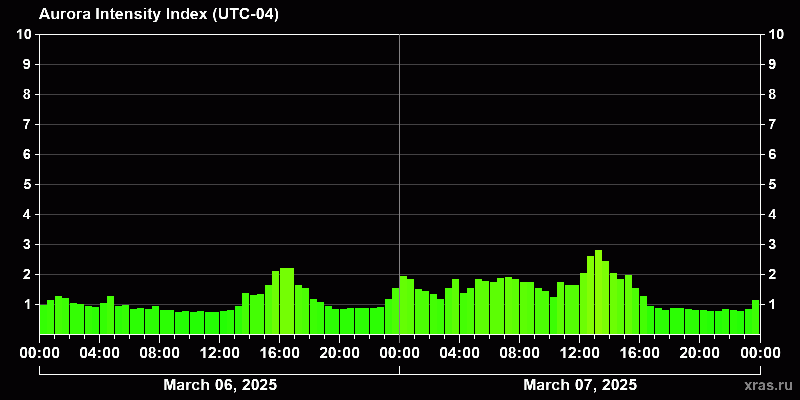 Auroral intensity index and the theoretically possible latitude of observations for nighttime in the Western Hemisphere as of 2025-03-07 23:59 (end of day) local time