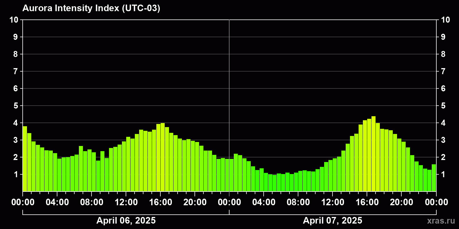 Auroral intensity index and the theoretically possible latitude of observations for nighttime in the Western Hemisphere as of 2025-04-07 23:57 (end of day) local time