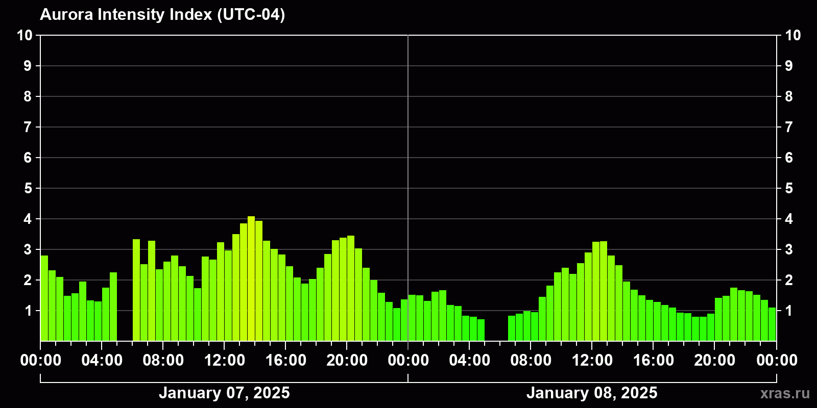 Auroral intensity index and the theoretically possible latitude of observations for nighttime in the Western Hemisphere as of 2025-01-08 23:51 (end of day) local time