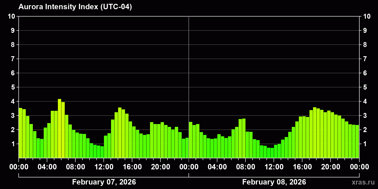 Auroral intensity index and the theoretically possible latitude of observations for nighttime in the Western Hemisphere as of 2026-02-08 23:47 (end of day) local time