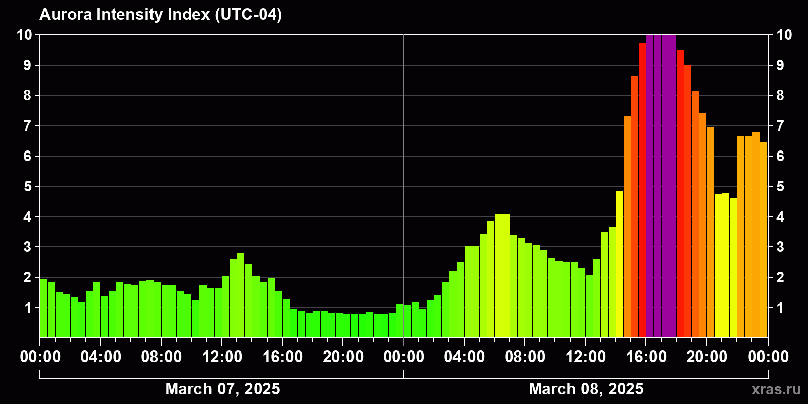 Auroral intensity index and the theoretically possible latitude of observations for nighttime in the Western Hemisphere as of 2025-03-08 23:55 (end of day) local time