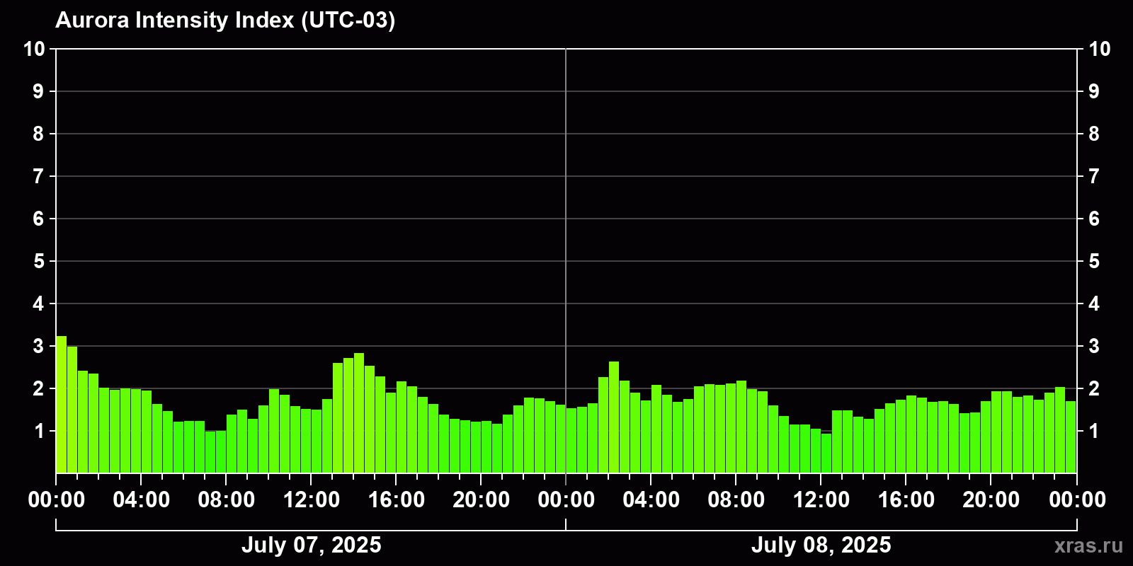 Changes in the auroral intensity index from 2025-07-07 to 2025-07-08 local time