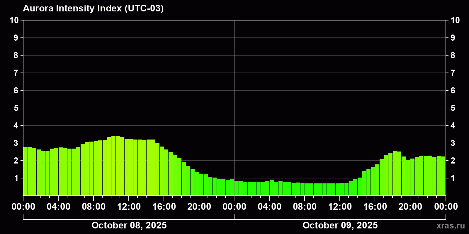 Auroral intensity index and the theoretically possible latitude of observations for nighttime in the Western Hemisphere as of 2025-10-09 23:51 (end of day) local time