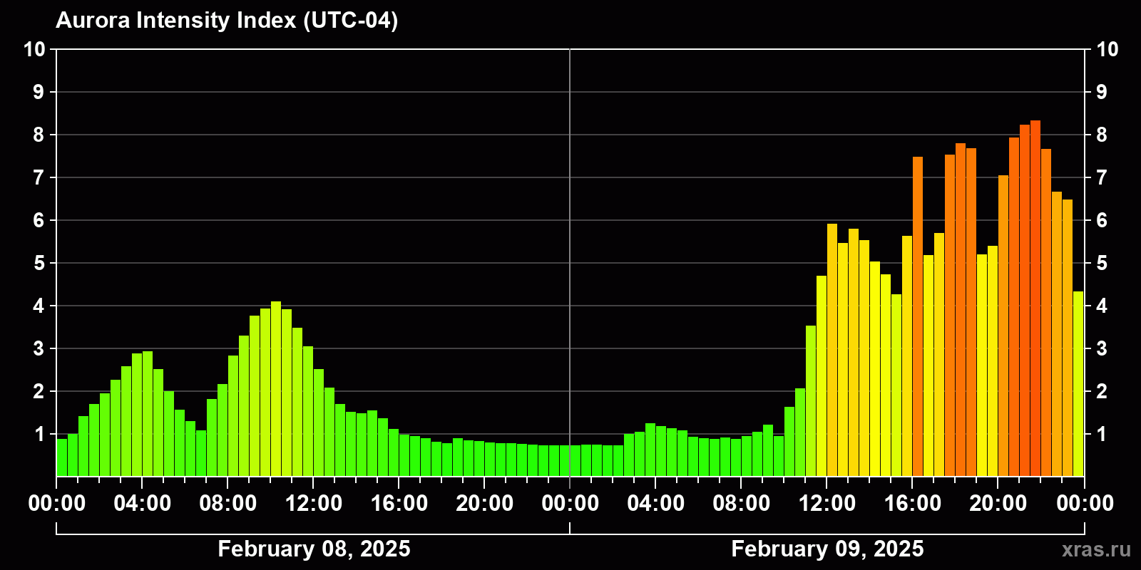 Changes in the auroral intensity index from 2025-02-08 to 2025-02-09 local time