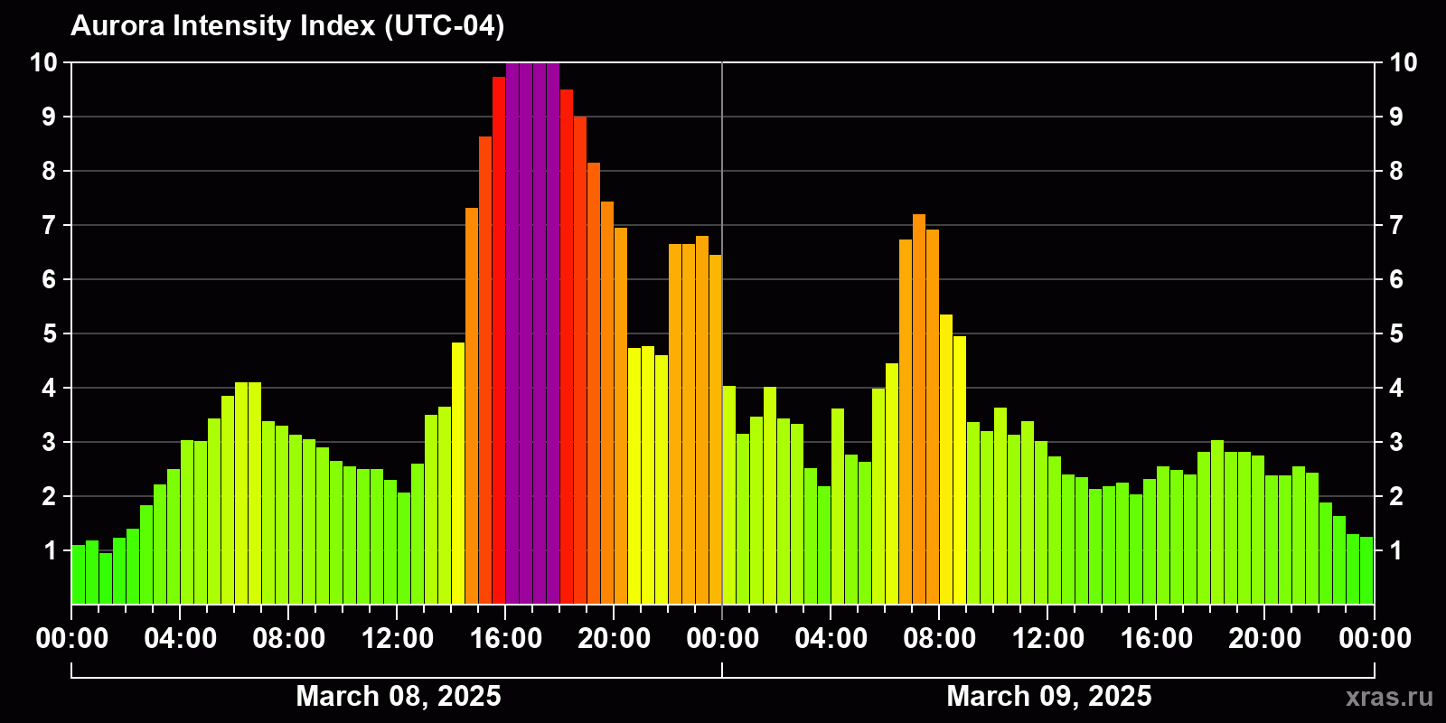 Changes in the auroral intensity index from 2025-03-08 to 2025-03-09 local time