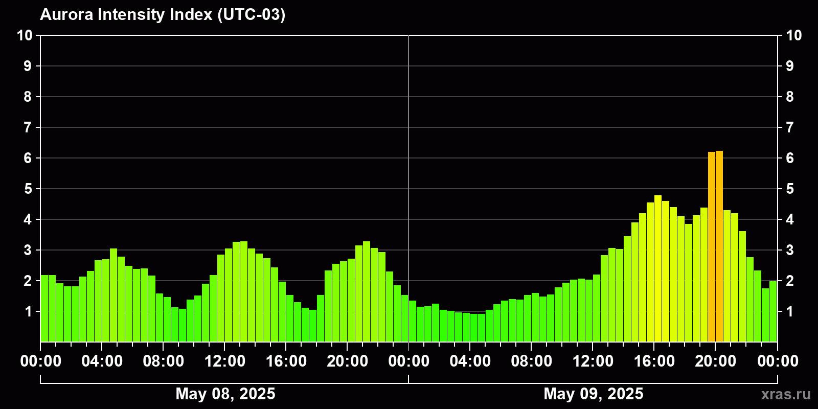 Changes in the auroral intensity index from 2025-05-08 to 2025-05-09 local time