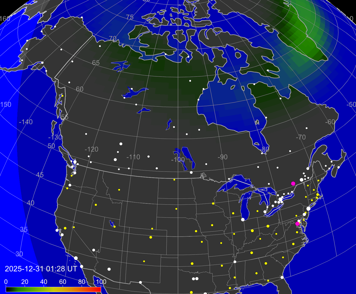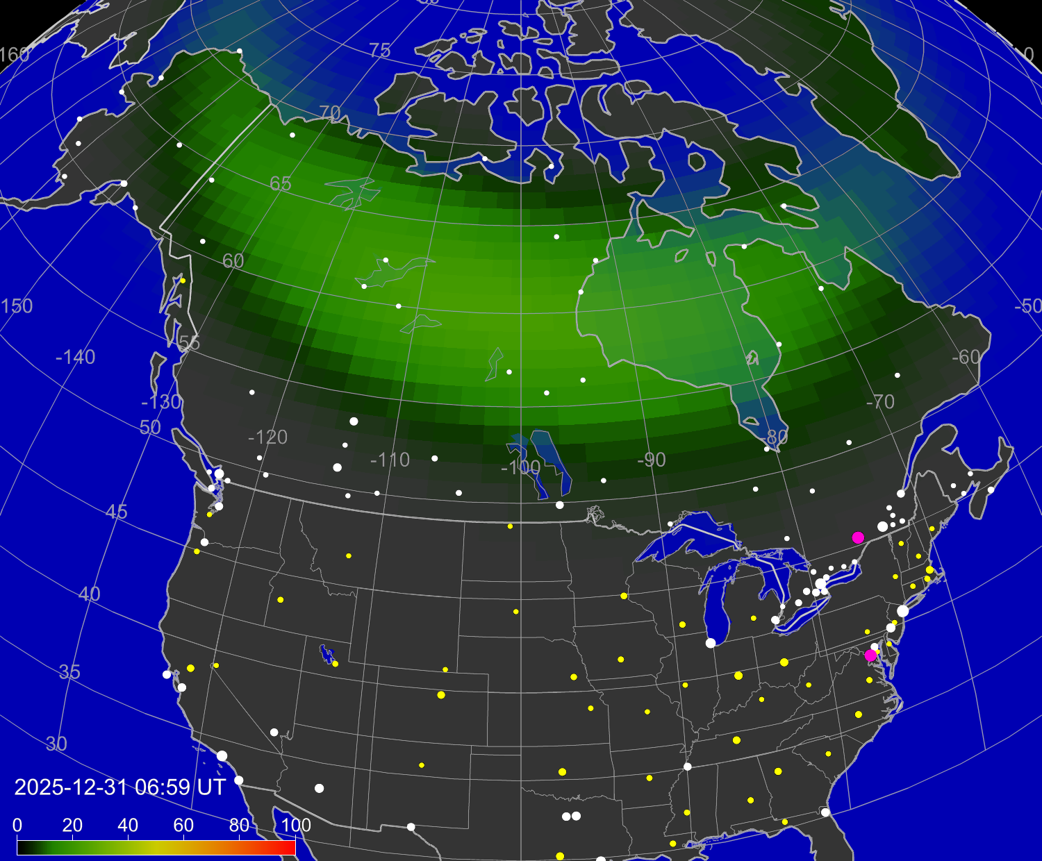 Вероятность полярных сияний в городах Канады
