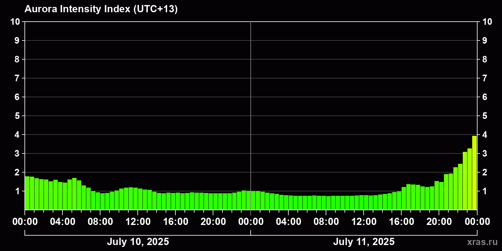Changes in the auroral intensity index from 2025-07-10 to 2025-07-11 local time