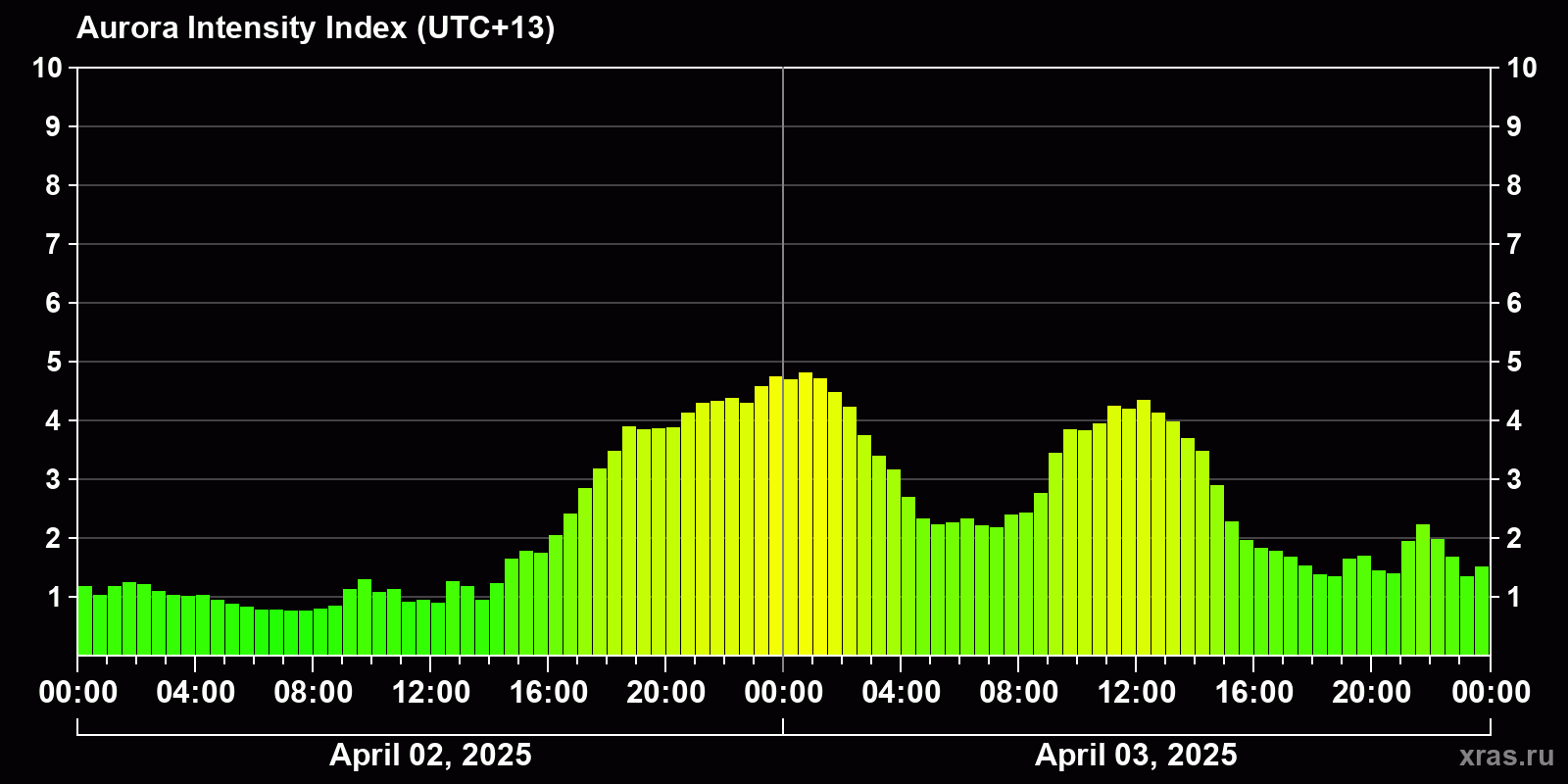 Changes in the auroral intensity index from 2025-04-02 to 2025-04-03 local time
