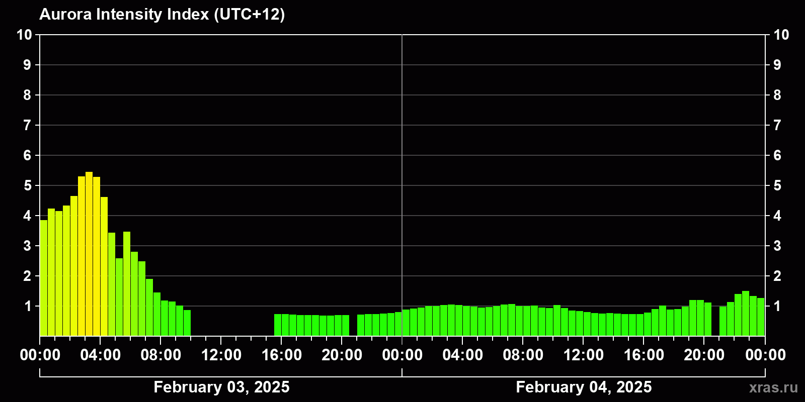 Changes in the auroral intensity index from 2025-02-03 to 2025-02-04 local time