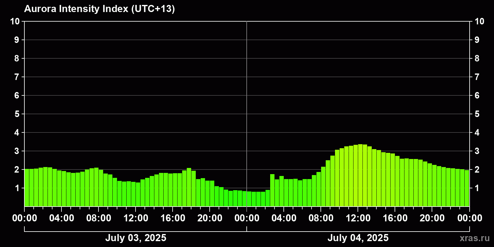 Changes in the auroral intensity index from 2025-07-04 to 2025-07-05 local time