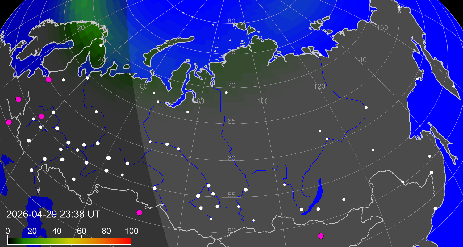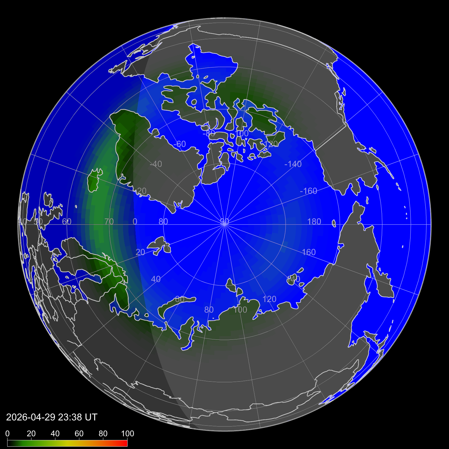 Changes and hourly forecast of the auroral intensity index from 2026-04-29 to 2026-04-30