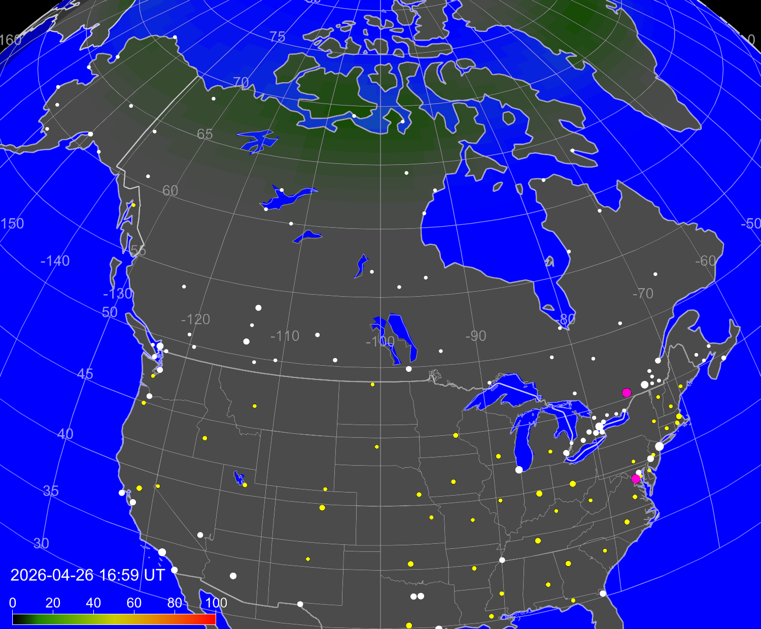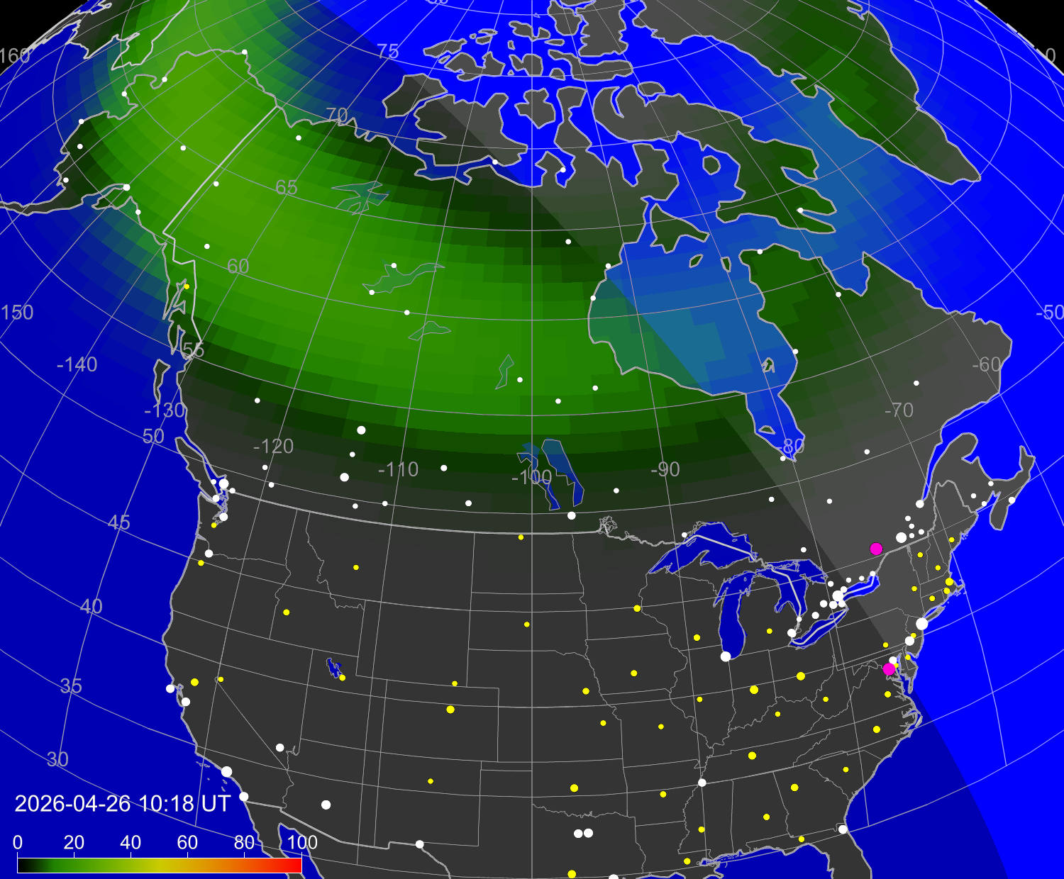 Probability of northern lights (auroras) in cities of United States