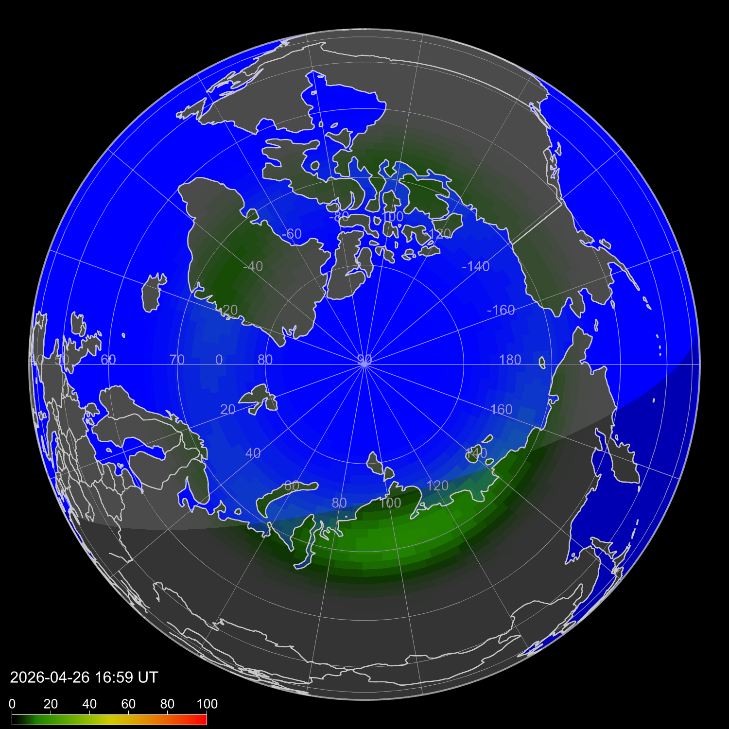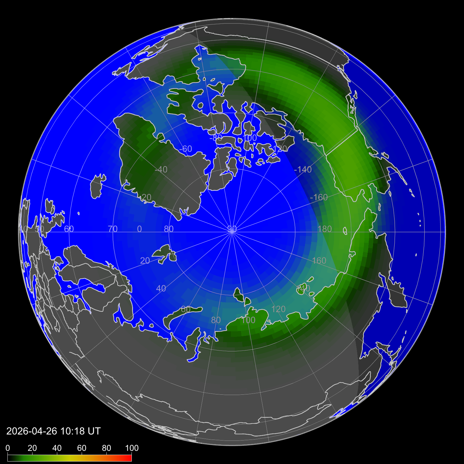 Auroral intensity index and theoretically possible latitude of observations for nighttime in the Western Hemisphere