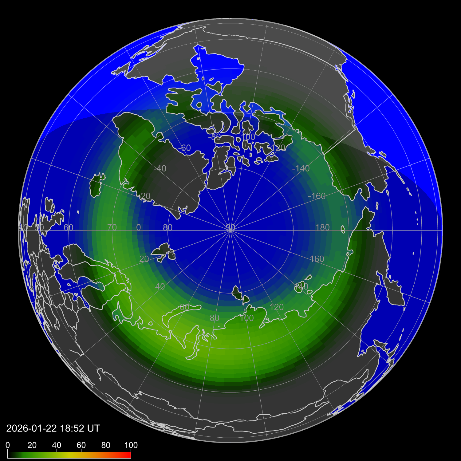 Индекс интенсивности полярных сияний и теоретически возможная широта наблюдений для ночного времени в западном полушарии