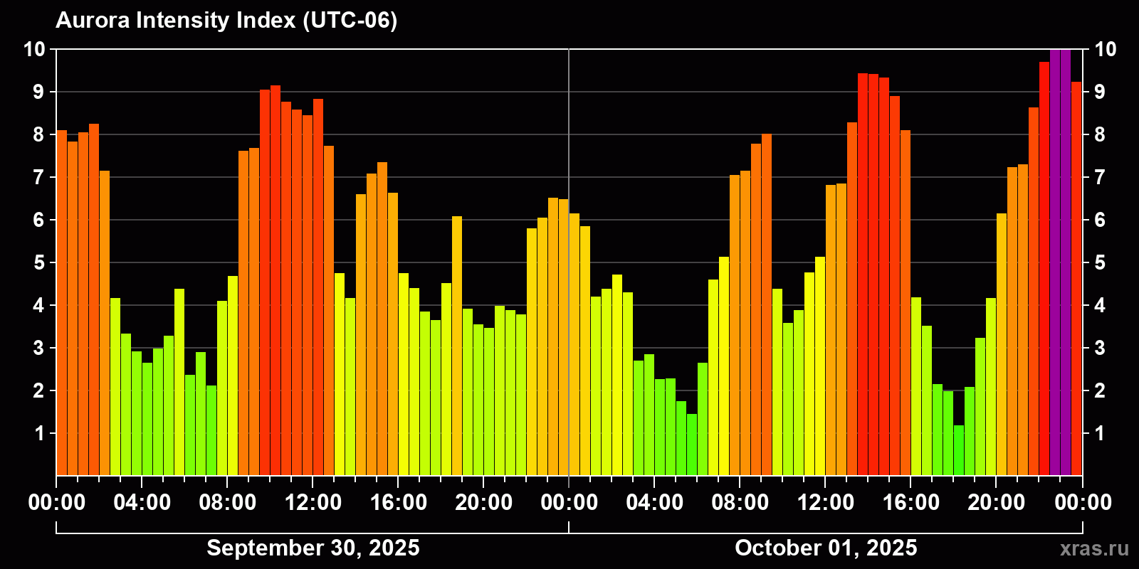 Auroral intensity index and the theoretically possible latitude of observations for nighttime in the Western Hemisphere as of 2025-10-01 23:50 (end of day) local time