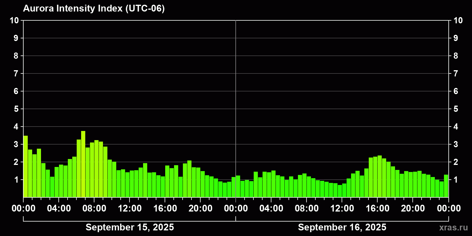 Auroral intensity index and the theoretically possible latitude of observations for nighttime in the Western Hemisphere as of 2025-09-16 23:47 (end of day) local time