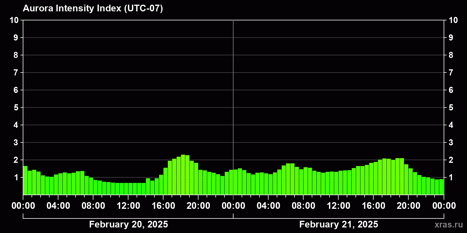 Auroral intensity index and the theoretically possible latitude of observations for nighttime in the Western Hemisphere as of 2025-02-21 23:58 (end of day) local time
