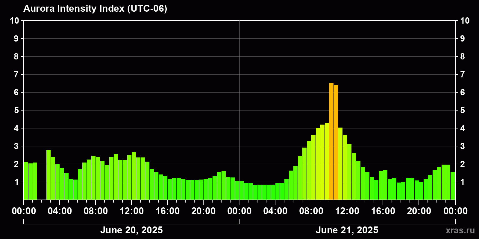 Auroral intensity index and the theoretically possible latitude of observations for nighttime in the Western Hemisphere as of 2025-06-21 23:46 (end of day) local time