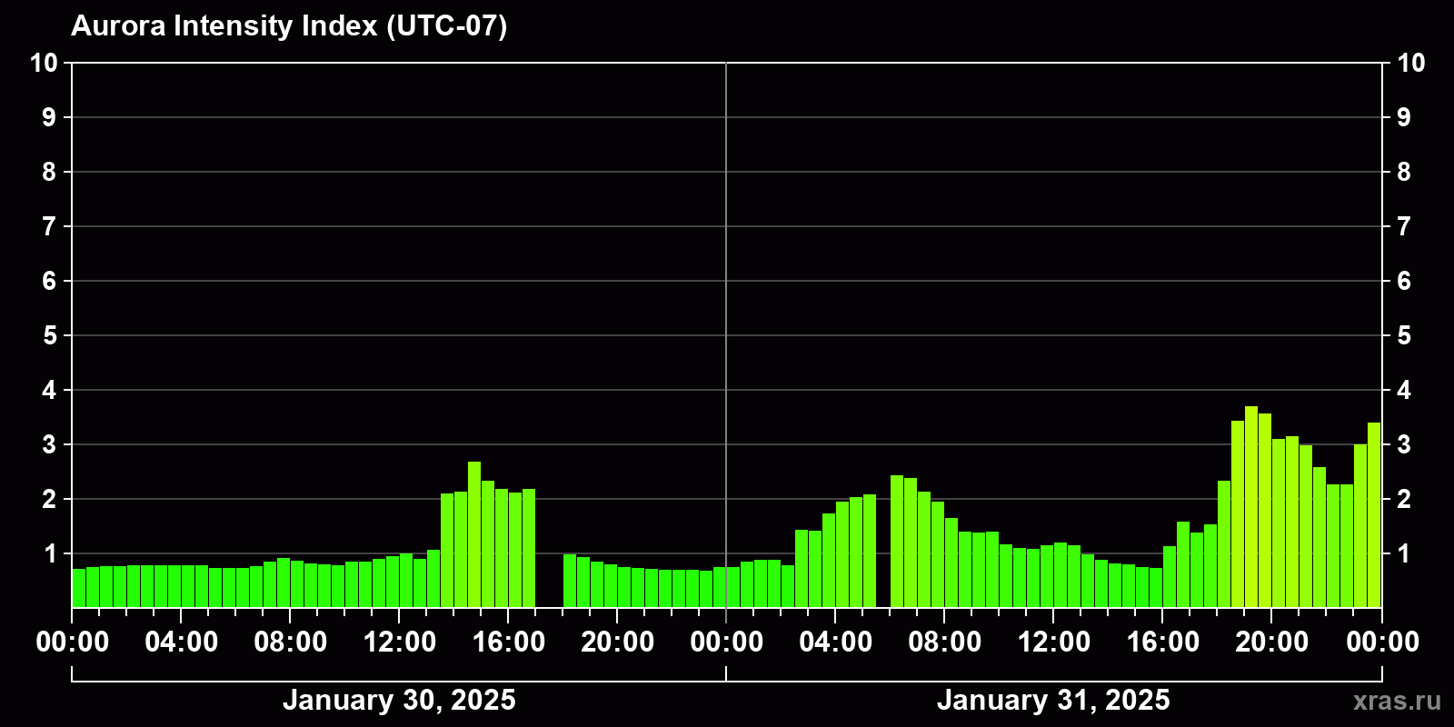 Changes in the auroral intensity index from 2025-01-30 to 2025-01-31 local time