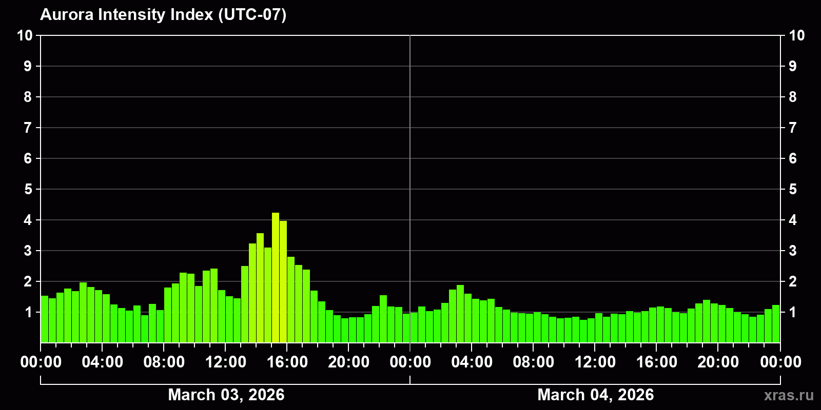 Changes in the auroral intensity index from 2026-03-03 to 2026-03-04 local time